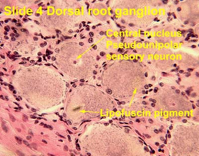 Find the large cell bodies of pseudounipolar sensory neurons . These cells have accumulations of Lipofuscin pigment and round, centrally-located nuclei . The nuclei are lightly stained but have prominent nucleoli. Notice that the neurons are not uniformly distributed within the ganglion but tend to be arranged in longitudinal bands separated by parallel bundles of myelinated nerve cell processes . Note that the myelin is not stained but that you can see a wavy pattern produced by the bundles of nerve fibers. Many Schwann cells are present among the fibers. Observe the satellite cells which ensheath each sensory neuron soma.