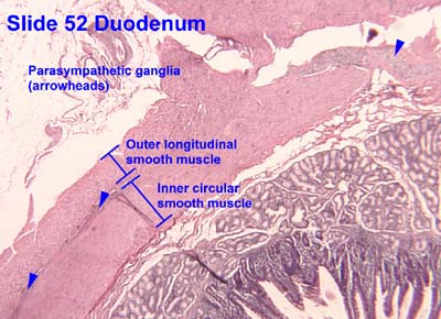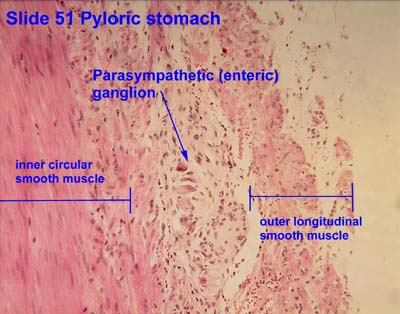 Again, observe parasympathetic (enteric) ganglia (Auerbach's plexi) between the i nner circular and outer longitudinal layers of smooth muscle.