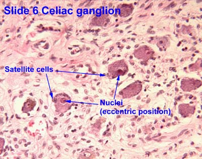 Observe neuron cell bodies and satellite cells in this autonomic (sympathetic) ganglion. Note that the cells appear to be ovoid and slightly angular in shape. Even though these are autonomic (multipolar, motor) neurons, the smallness of their dendrites and the layer of surrounding satellite cells obscures the angular nature of the neurons. Many of the nuclei of the neurons tend to be located in an eccentric position. The nerve cell bodies are randomly scattered throughout the ganglionic mass, and the bundles of nerve cell processes are arranged irregularly rather than in discrete bundles.