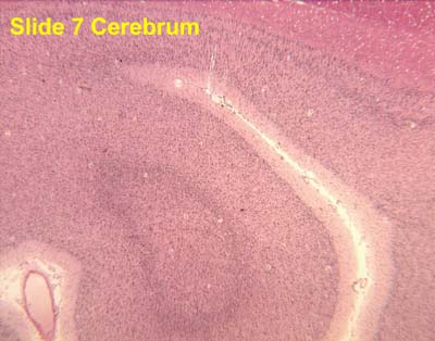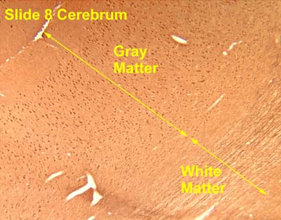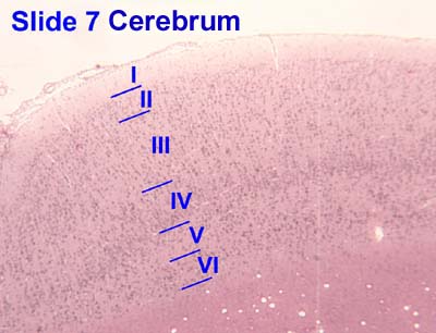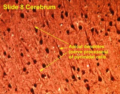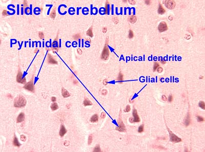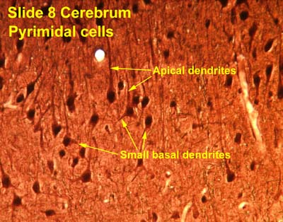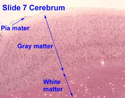 Most external in this slide is the pia mater , then gray matter , and most internally is the white matter . The gray matter is arranged in six ill-defined layers of nerve cells . See if you can delineate the layers of cells in the cortex (you will not be required to do this for exam purposes). Study the larger neurons in the slide; they are pyramidal cells and are a type of multipolar neuron. Observe the large apical dendrite projecting toward the surface of the cortex. Observe the many nuclei of glial cells .