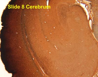 The staining technique in this slide demonstrates lipid , the predominate component of myelin . Compare with Slide I and note the similarities and differences.