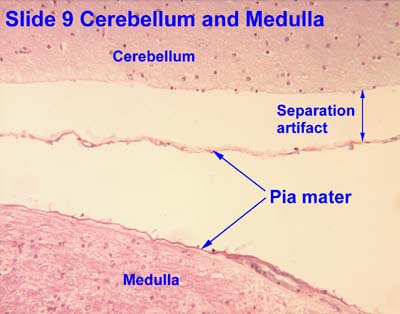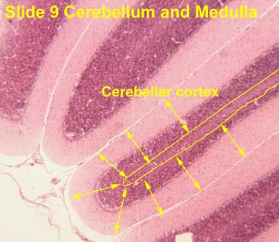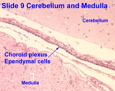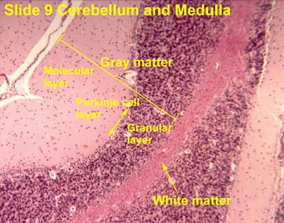 In the cerebellum, the gray matter consists of an inner granular layer , Purkinje cell layer , and outer molecular layer . Identify the large Purkinje cells of the Purkinje cell layer. These three layers (molecular, Purkinje, and granular) constitute the cerebellar cortex . Observe the numerous granule cells (small neurons) constituting the granular layer. Note the pia mater closely adherent to the cerebellum. Note the differences between the cerebellum and medulla which are both present in this slide. Locate the small amount of choroid plexus between the medulla and cerebellum. Observe the cuboidal appearance of the modified ependymal cells that make up the choroidal epithelium.