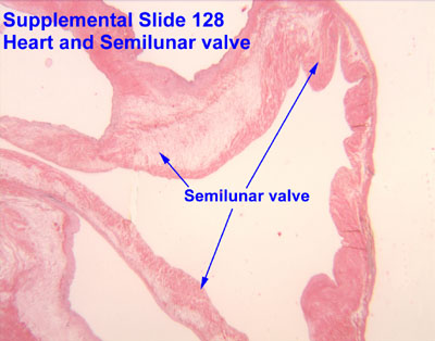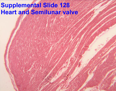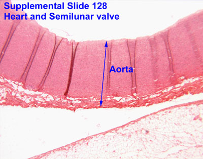 Again note the endocardium and myocardium of the atrial wall. This section shows one leaflet of the semilunar valve and the fibrous skeleton of the heart. Also observe the portion of the aorta present in this slide. The membranous and muscular parts of the interventricular septum are also present near the valve.