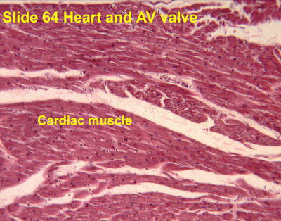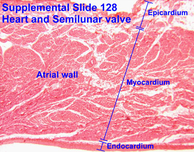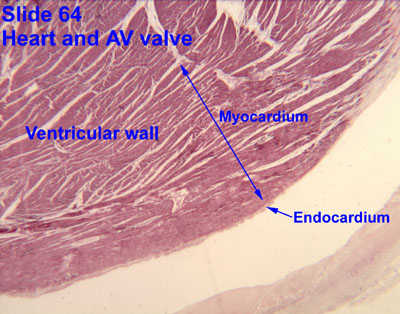 This slide is a full thickness section heart wall which includes atrium , ventricle and an AV valve leaflet . Note the difference in thickness of the atrial and ventricular walls (correlates with differences in pressure and work loads). The musculature of both walls is composed of cardiac muscle cells which exhibit the usual characteristics of cardiac muscle, i.e., branching, anastomosing, central nuclei, myofibrils, cross striations, and intercalated disks. The musculature of the atria is not continuous with that of the ventricles. Note that the atrial endocardium is very thick but that the ventricular endocardium is very thin.