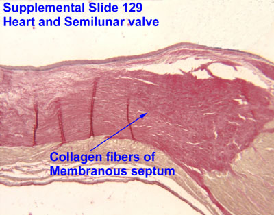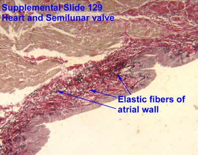 This is the same section of heart in Slide 128. In this slide the collagen forming the connective tissue investments (including the membranous septum ) is red and the elastic fibers are stained black. Note the relatively greater amount of elastic fibers in the atrial wall of the heart.