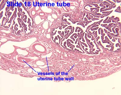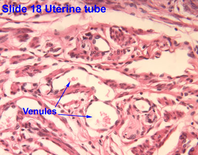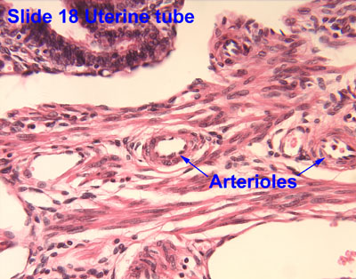 Find the multitude of vessels in the connective tissue which invests the oviduct. This slide is especially good for observing small arteries , veins , arterioles , venules , and capillaries . Identify the layers of the vessels present.