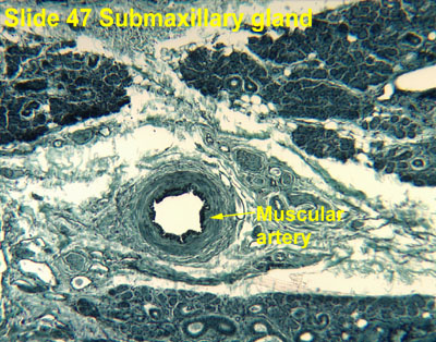 Slide 47 Submaxillary gland, Verhoeff's hematoxylin; mucicarmine & methyl green.