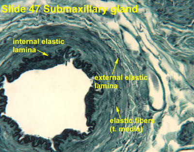 Find the muscular arteries . Internal and external elastic laminae (or membranes) are stained black and therefore readily observed. Look carefully in the media of the arteries and you should be able to resolve elastic fibers also.