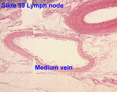 Use this slide to appreciate the contrasting features of a medium sized artery (muscular artery) and vein . The vein is typical of vessels not surrounded and supported by solid tissue. Veins in these locations have a well developed muscular adventitia (muscle cells are oriented longitudinally). This is also the typical structure of large veins such as the vena cava.