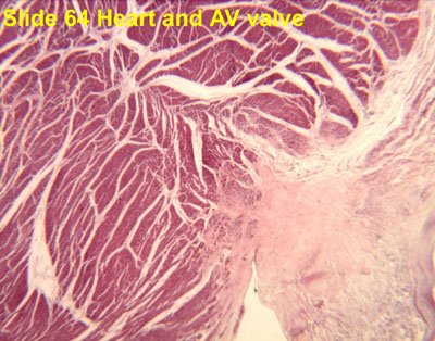 Observe the AV valve leaflet and its attachment to the fibrous skeleton of the heart. The AV valve leaflet is formed by a fold or duplication of the endocardium; note especially the dense connective tissue core which forms the central part of the valve leaflet. The upper or atrial surface of the valve is thick and resembles atrial endocardium, and the lower or ventricular surface of the valve is thin and resembles ventricular endocardium.