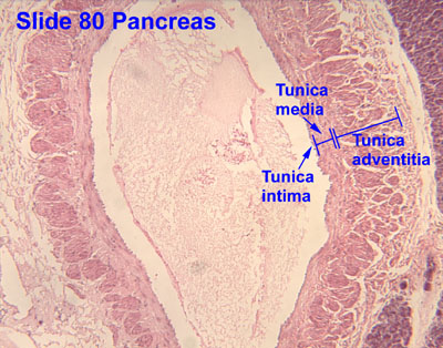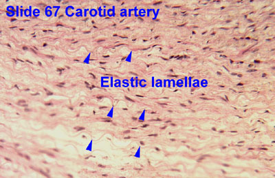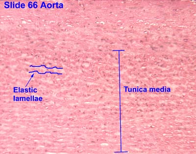 Contrast the artery with the vein . Observe the intima, media, and adventitia. In the artery, the elastic lamellae are readily observed. The aorta compared to the carotid artery has a thicker intima and more elastic lamellae in the media.