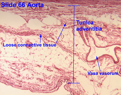 In the aorta, the tunica media constitutes the greater part of the vessel wall. It is made up of multiple elastic lamellae alternating with thin layers of circularly oriented smooth muscle . The boundary between the tunica intima and media is not readily defined, and the internal elastic lamina is merely the innermost of the many elastic lamellae within the wall. The tunica adventitia essentially lacks elastic lamellae, and is mainly loose connective tissue and blood vessels (vasa vasorum).