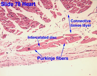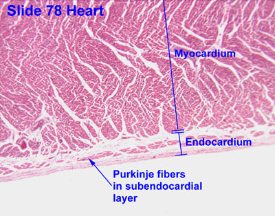 In the subendocardial layer , locate the longitudinally sectioned Purkinje fibers . Note that 1) they are connected by intercalated discs , 2) they are larger than the ordinary cardiac myocytes, and 3) they are separated from the myocardium by a connective tissue layer which is actually a sheath in the intact heart.