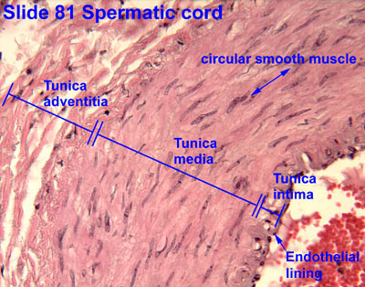 This slide has several muscular arteries mixed in with atypical veins of the pampiniform plexus . These veins contain a greater amount of smooth muscle than most veins of this size. Also note the outer longitudinal arrangement of smooth muscle in these veins. Observe the characteristic three layers of the arteries present. Note the large amount of circularly arranged smooth muscle in the media of the muscular arteries.