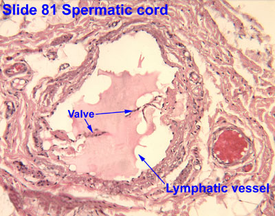Find the lymphatic vessels of the spermatic cord. Like the veins (pampiniform plexus) of the spermatic cord, these lymphatic vessels have unusually thick walls. Note the valve leaflets of this vessel.