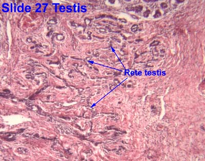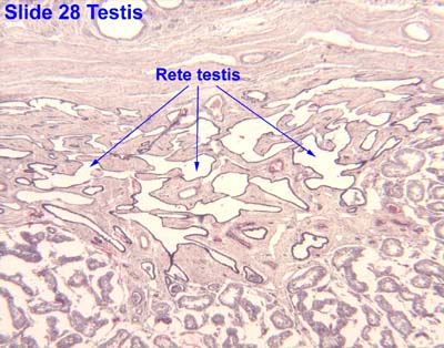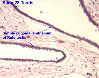 Examine the rete testis in the mediastinum. The rete are communicating channels between the straight tubules and efferent tubules (ductules). They are lined by simple cuboidal epithelium . No smooth muscle is present in this region.