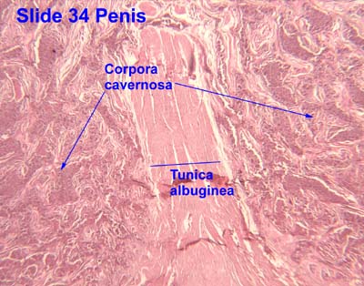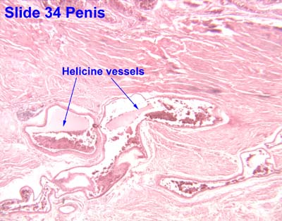 Look at this slide grossly and at the microscope level. Observe the paired corpora cavernosa of the penis and corpus spongiosum surrounding the penile urethra . In these structures there are numerous blood-filled venous spaces surrounded by connective tissue and slips of smooth muscle; this is erectile tissue . The corpora cavernosa are surrounded by dense collagenous connective tissue; the tunica albuginea . Observe the helicine vessels . Note also the penile urethra lined by pseudostratified columnar epithelium.