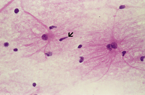 Reactive astrocytes in smear, HE stain: The two large cells with stellate shaped cytoplasmic processes are reactive astrocytes. Reactive astrocytes do not usually have prominent nucleoli. The small elongated cell (arrow) may represent a microglial cells. The naked small round nuclei in this photo are most likely nuclei of astrocytes or oligodendrocytes.