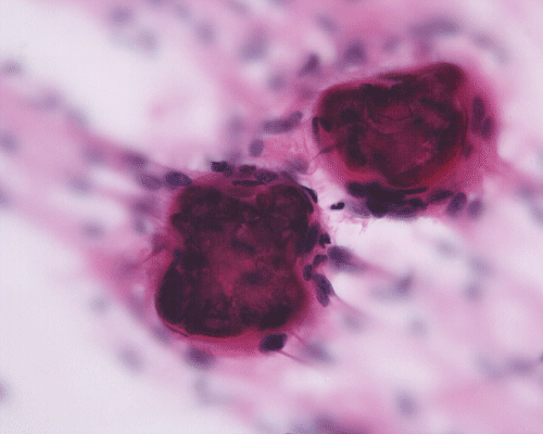 Psammoma body in a smear: Note that the calcified psammoma is rimmed by a thin layers of meningioma cells.