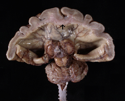 Alobar Holoprosencephaly: Note there is no separation of the cerebral hemispheres into left and right. The cardinal diagnostic feature is the extension of gray matter across the midline (arrow).