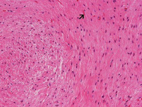 Reactive gliosis: This image was obtained from an area with reactive gliosis around the cystic component of a craniopharyngioma. Note that there is no atypia or pleomorphism in the reactive astrocytes and there are also Rosenthal fibers (arrow). Without a clinical suspicion or knowledge of clilnical information, this histopathologic picture may suggest pilocytic astrocytoma on frozen sections or small biopsies where the craniopharyngioma component is not present.