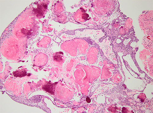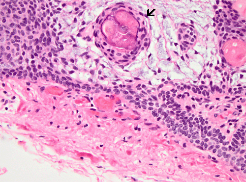 Craniopharyngioma, HE: Low and high magnification of an adamantinomatous type of cranipharyngioma. Note the presence of microscyst formation, wet keratin pearls (arrow) and the stellate cells around the keratin pearls.