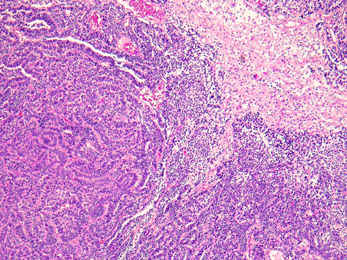 Panel B: This picture shows the transition between cells in solid sheet arrangement and trabecular arrangement.