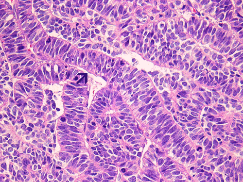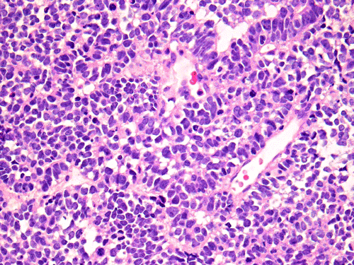 Panel C: Many of the tumor cells arrange in a trabecular arrangement with a basement membrane (arrow). This arrangement is reminiscent of the earliest stage (neuroepithelium) of the development of the central nervous system.