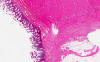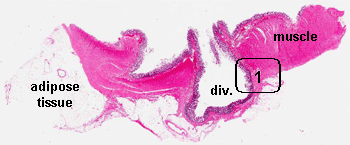 Area 1: This is a Masson' Trichrome stain which stains muscle red and fibrous tissue blue. The relationship between the muscle, the fibrous tissue, and the diverticulum is clearly illustrated here. |
