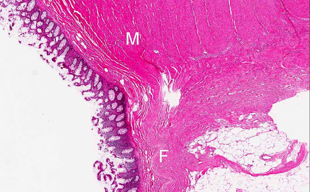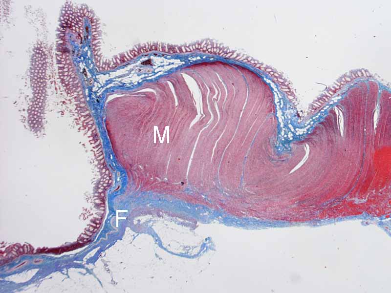 Area 1: This photo is taken at the junction where the diverticulum herniate through the muscle (M). The mechanical support for the flask-shaped structure is only supported by a thin layer of fibrous tissue (F). Note that no inflammatory changes is present in this diverticulum. |