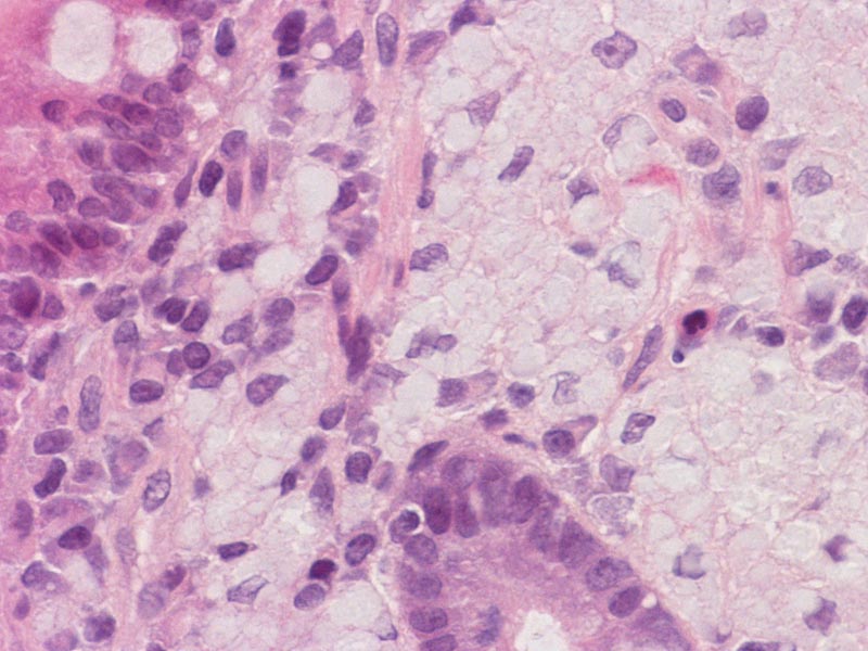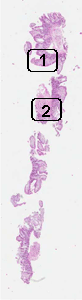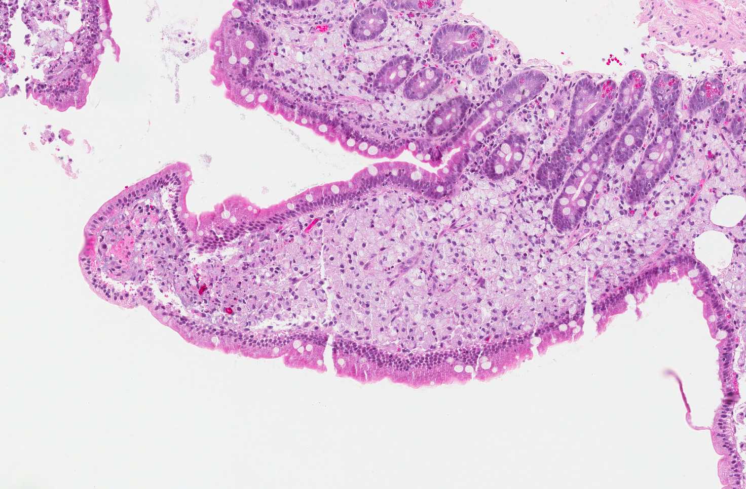 Area 1: The subepithelial regions of the villi are entirely replaced by foamy histiocytes. Note that the macrophages have foamy cytoplasm, distinct cell border, and rather monotonous, round, and roughly centrally located nuclei. The villi are expaned and blunted by the foamy histiocytes. |