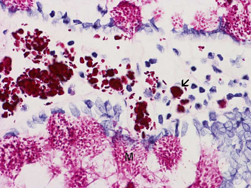 Periodic acid Schiff (PAS) stain with diastase digestion: Glycogen is also PAS positive but they can be digested away by diastase. In this prepartion, the section is first digested with diastase before the PAS stain. The purple-red positive staining material (arrow) persists indicating that the positive substances are not glycogen. Note that the mucin of the epithelial cells are also PAS positive and diastase resistant (M). |