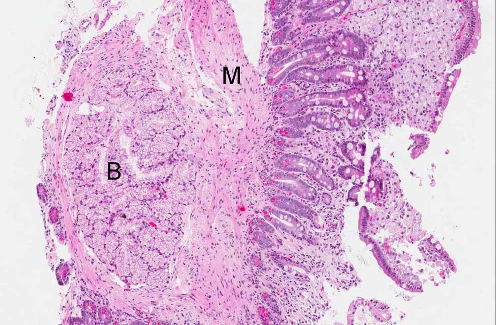 Area 2 (Brunner's gland): You can find Brunner's gland (B) under the muscularis mucosa (M) in this specimen which is a diagnostic feature of duodenum. |