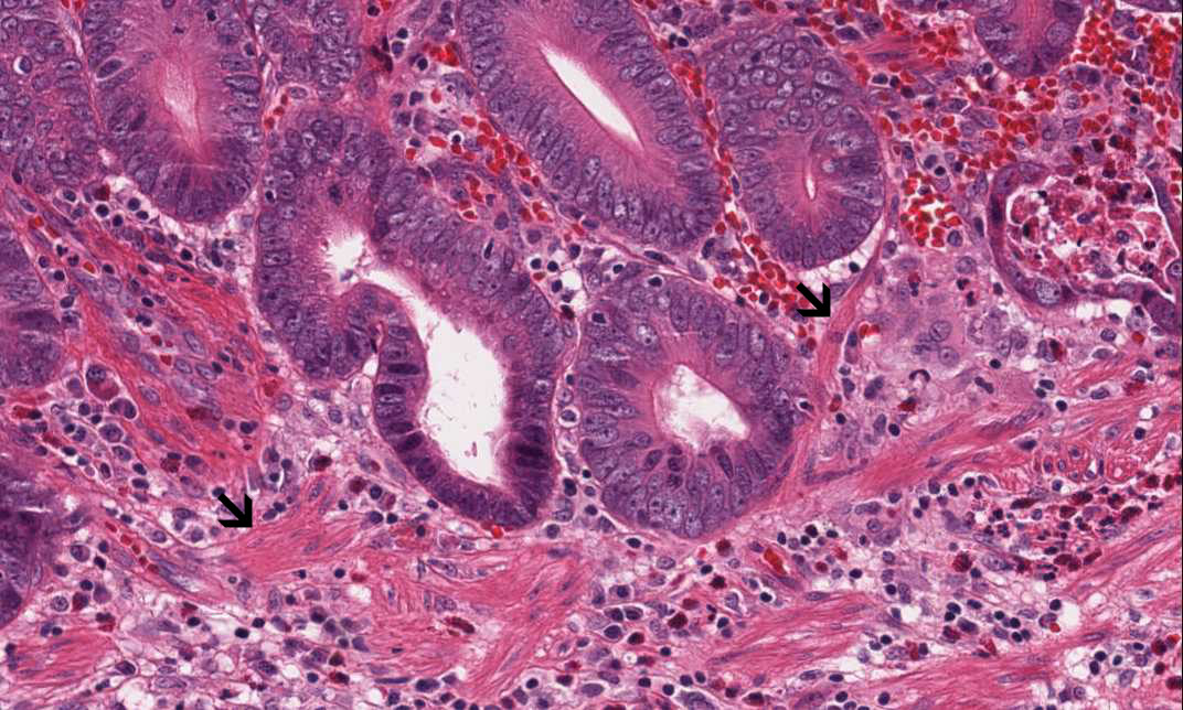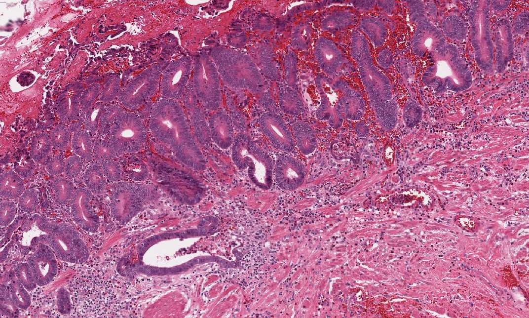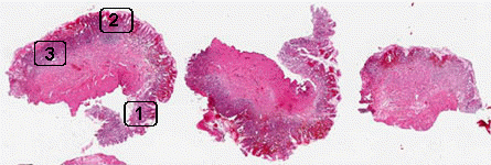 Area 3: The muscularis mucosa is not penetrated as illustrated. However, the tumor cells has already reached the smooth muscle fibers (arrow). |
