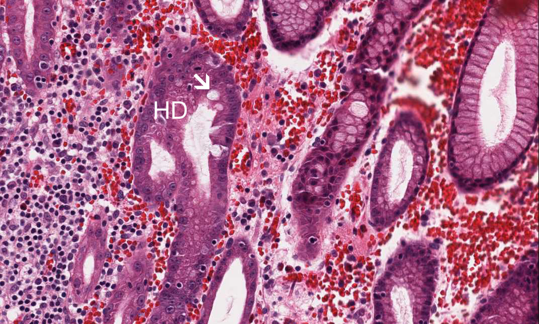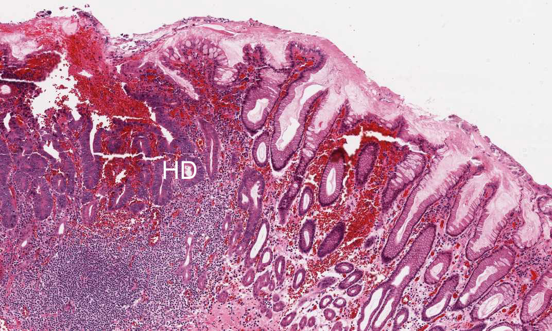 Area 2: Compare the area with high grade dysplasia (HD) and the normal appearing glands on the right of the image. At the interface between the Barrett's esophagus and high grade dysplasia, there are also glands with high grade dysplastic change (HD) and with goblet cell formation. |