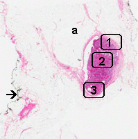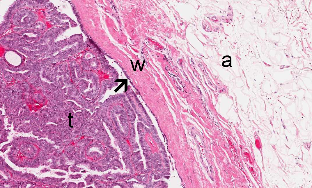 Area 2: Note collagenous wall of the duct (w) and the surrounding adipose tissue (a). The inner surface of the duce is lined by epithelial cells (arrow). Note that there is some hyperplastic proliferation of epithelial cells in this area (t). |