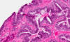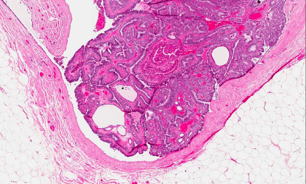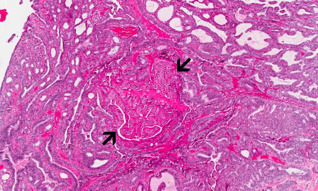 Area 3: Note that there is an island of epithelial cells with slightly increase in size and significantly more eosinophilic than the surrounding cells (outlined by the arrows). These are cells with apocrine metaplasia (oncocytic changes) and is bengin. |