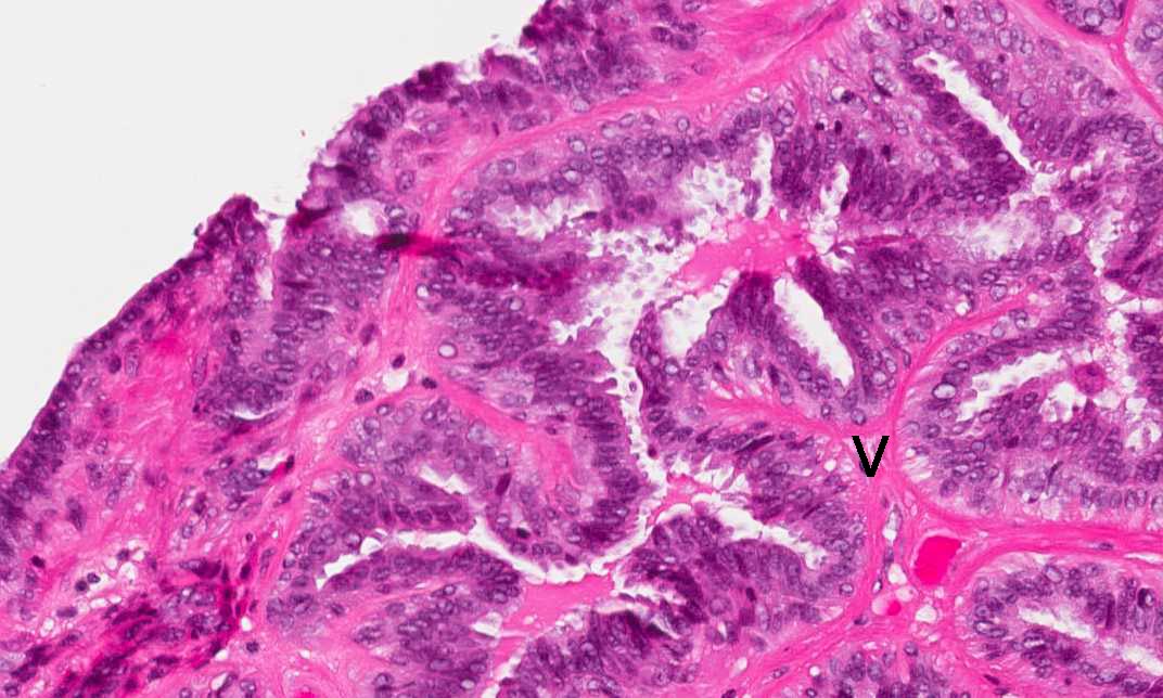 Area 2: Note the papillary, finger-like fibrovascular core (v) that that supports the epithelial cells. There is only one single layer of lining epithelial cells. |
