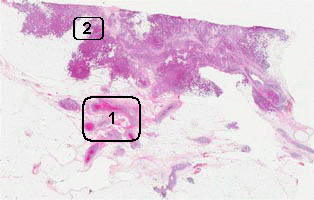 Area 1: Ductal carcinoma in situ (DCIS) component. |
