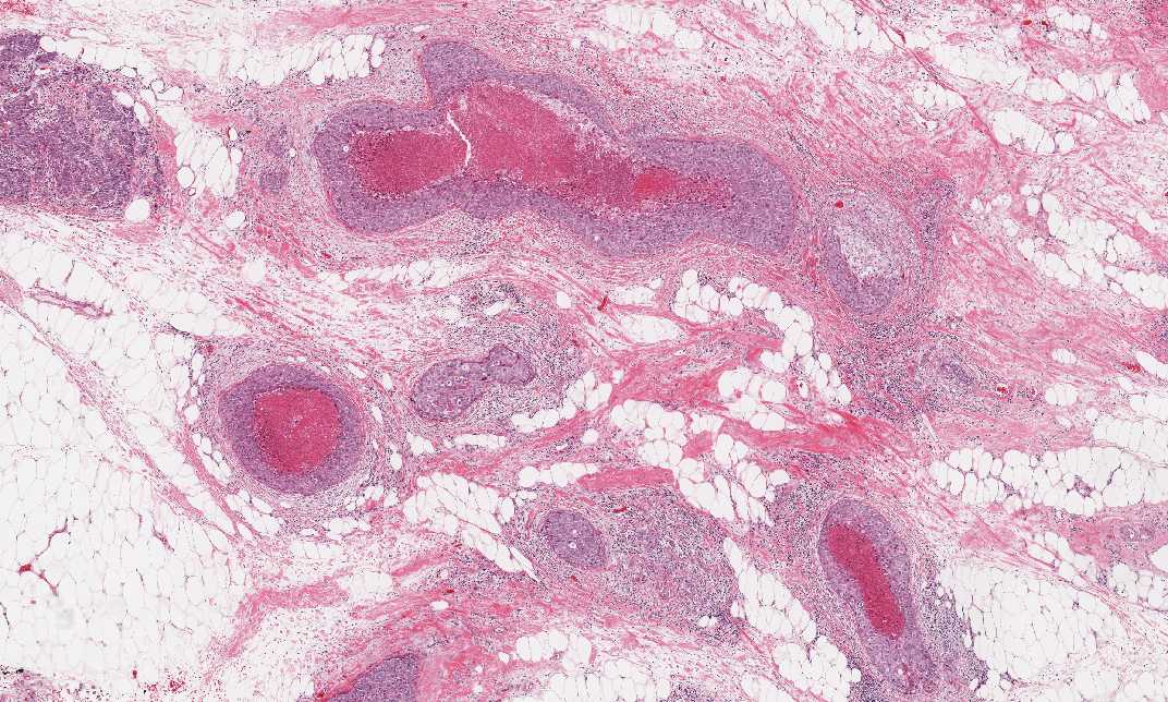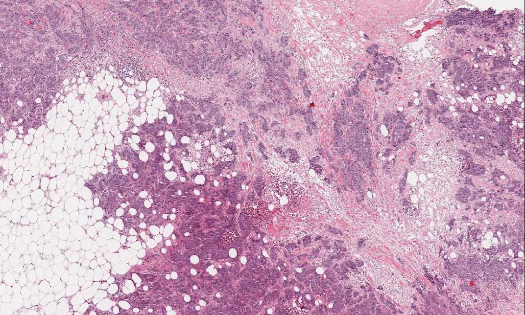 Diagnosis: High-grade ductal carcinoma in situ with comedo type necrosis and poorly differentiated invasive ductal carcinoma