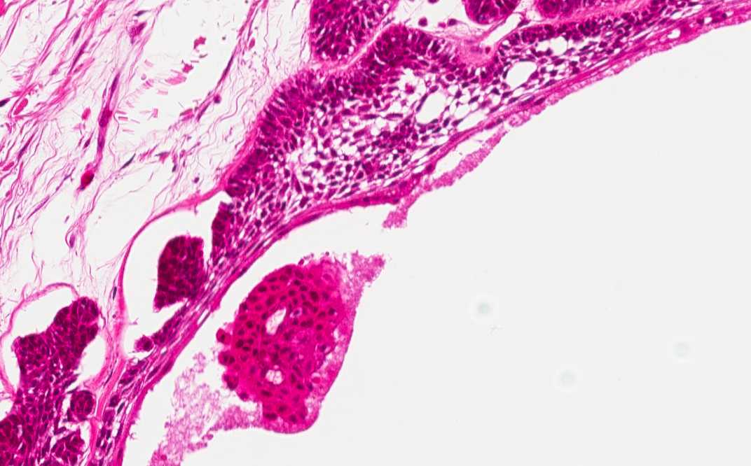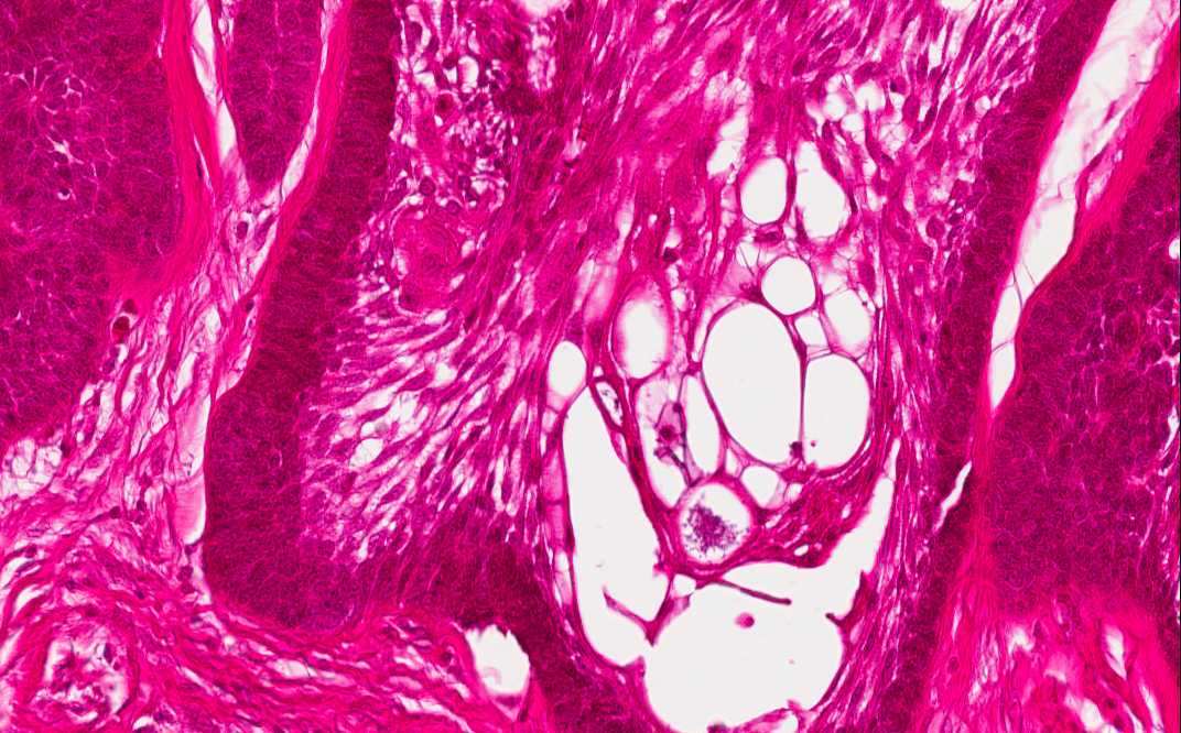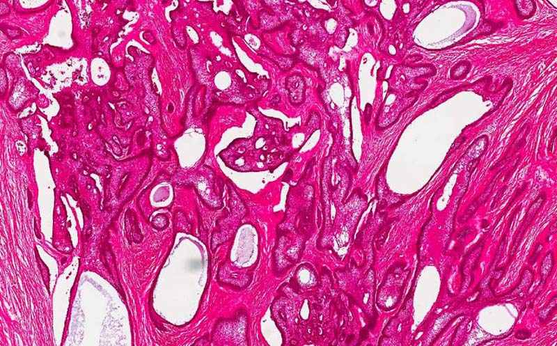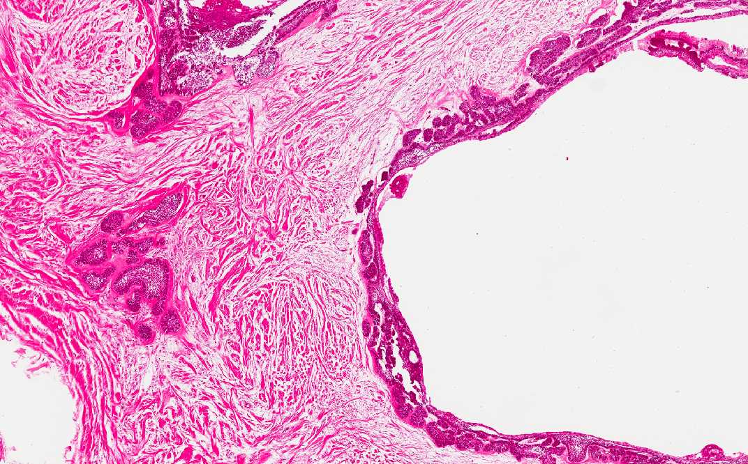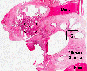 Area 2: Note that the cyst are lined by palisading columnar cells with reversed polarity. Cyst formation is very common in ameloblastomas. Some of the cyst may be, at least partially, lined by attenuated squamous epithelium that lacks features of ameloblasts. |
