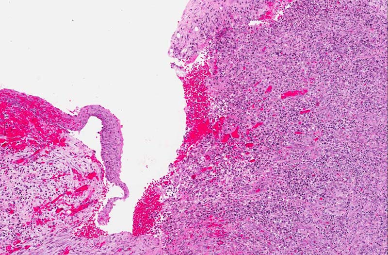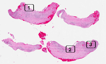 Area 3: The ulcerated area is lined by a mixture of chronic inflammatory cells including lymphocytes and plasma cells. Also present is formation of new blood vessels. |