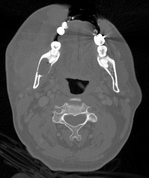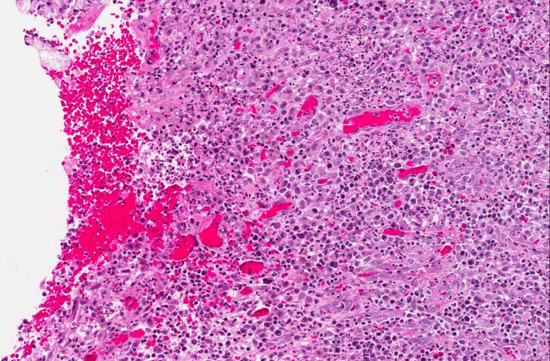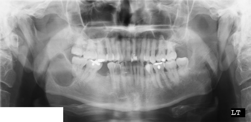 History: The patient was a 49 year-old man who presented with right facial swelling and pain in his jaw, 10 day history of right facial edema, and inability to open his mouth. He was treated with drainage and antibiotics. On further studies, there was a radiolucent lesion at the angle of the mandible suggestive of a cystic lesion. Surgical treatment included incision and drainage of abscess and biopsy of the mandibular cyst which yielded the current specimen.