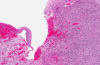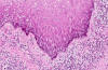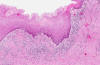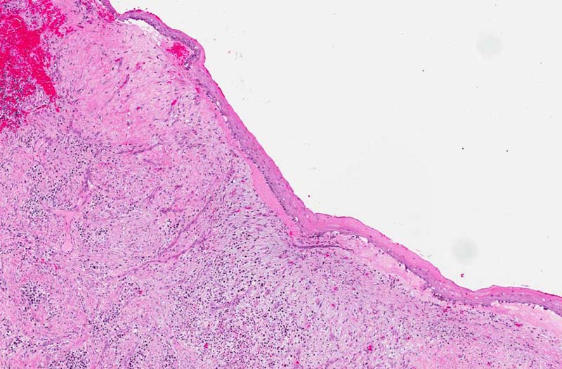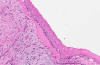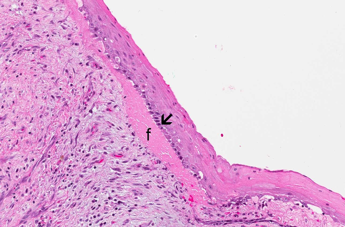 Area 1: Note that there the covering squamous epithelium is thin and free of dysplastic changes. The basal layer is composed of columnar cells with hyperchromatic nuclei, columnar shape, vague palisading arrangement (arrow). A small amount of fibrinous exudate (f) is present in between the squamous epithelium and the underlying stroma. This is not part of the classic features of this type of cyst but rather a result of the inflammation. |
