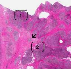 present in this backgound of lymphocytes are eosinophils (area 2).