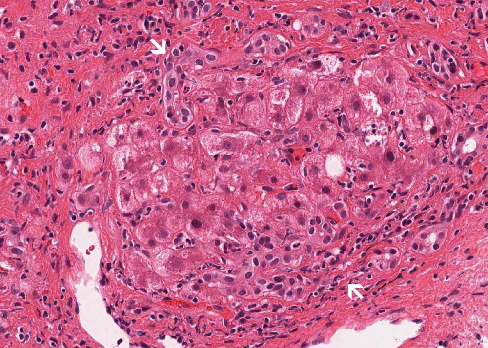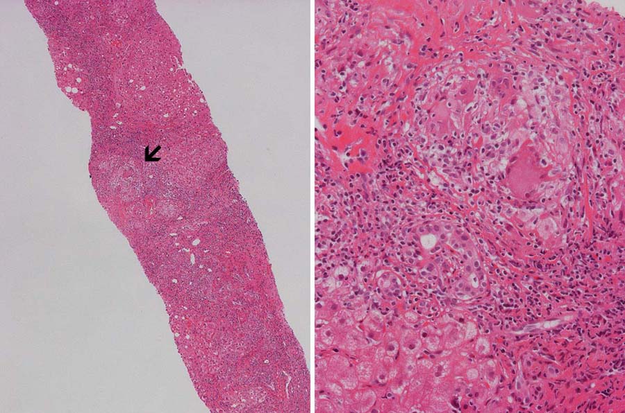 History: The patient was a 56 year-old African American woman who presented with constitutional symptoms of vague abdominal pain, fatigue and weight loss. Her past medical history was significant for hypertension and otherwise unremarkable. Physical examination was remarkable for abdominal fullness and hepatosplenomegaly. A chest and abdominal computed tomography scan showed normal pulmonary and mediastinal anatomy with a moderately enlarged liver and spleen. Her laboratory data, including routine chemistries and complete blood count, were within normal limits, albeit a borderline low platelet count. Liver function tests were normal. Anti-mitochondrial antibody (AMA), antinuclear antibody (ANA), antineutrophil cytoplasmic antibodies (ANCA) and anti-smooth muscle antibody were all negative. Hepatitis and CMV serologies were also negative. A liver biopsy was performed which generated the current specimen. A follow up test on serum angiotensin converting enzyme showed (ACE) elevation.