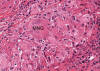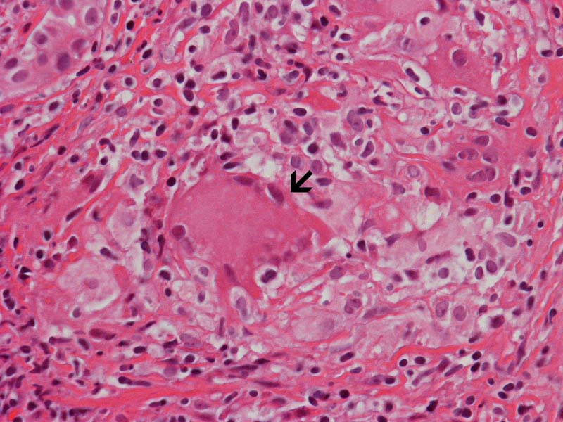 Granuloma: This is another image that show the granuloma (arrow in the left panel). This image provides a good survey on the extent of granulomatous changes. A multinucleated giant cell is present (arrow in the right panel) |