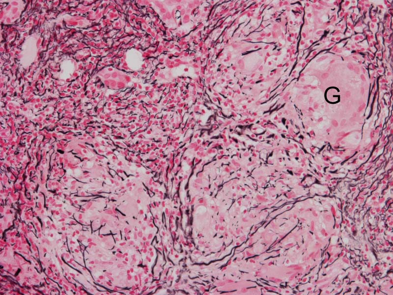 Reticulin Stain: The granuloma are well delineated by reticulin fibers. Some of the reticulin fibers extend into the center of the granuloma which is a feature of sarcoidosis. |
