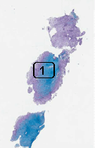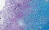 Luxol Fast Blue and PAS Stain: Luxol fast blue demonstrates normal myelin in blue. This photo is taken from area 1 and you can see that the area infiltrated by macrophages does not have much myelin but the area that is not infiltrated by macrophages has myelin. This indicates a lost of myelin. This is a classic histopathologic finding. The macrophages are scavengers that remove the degraded myelin. The PAS stain is a counter stain but it has the ability to stain up the lysosomes in macrophages red. |