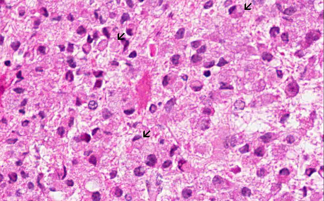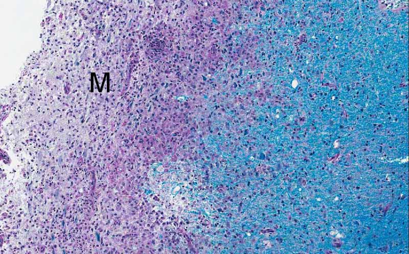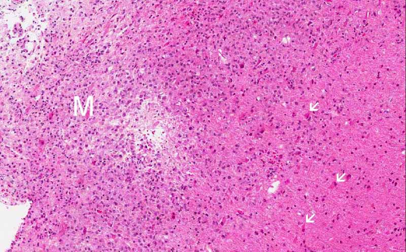 Area 1: This image is taken at the interface of the area extensively infiltrated by macrophages (M) and area far less significantly infiltrated by foamy macrophages and many reactive astrocytes (white arrows) are present in this area. On high magnification, note that the foamy histiocytes have a moderate amount of cytoplasm with a bubbly or foamy appearance. Hence they are called foamy macrophages. |
